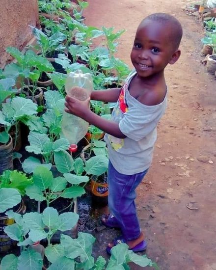 For example, Irene and her team teach young people how to turn waste into manure to increase soil fertility, thus supporting food production in their homes and reducing greenhouse emissions into the atmosphere. Other activities are geared towards food security by composting kitchen waste and re-using plastics as irrigation containers and garden beds.